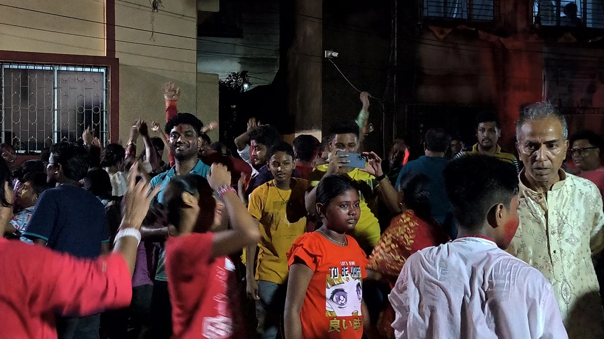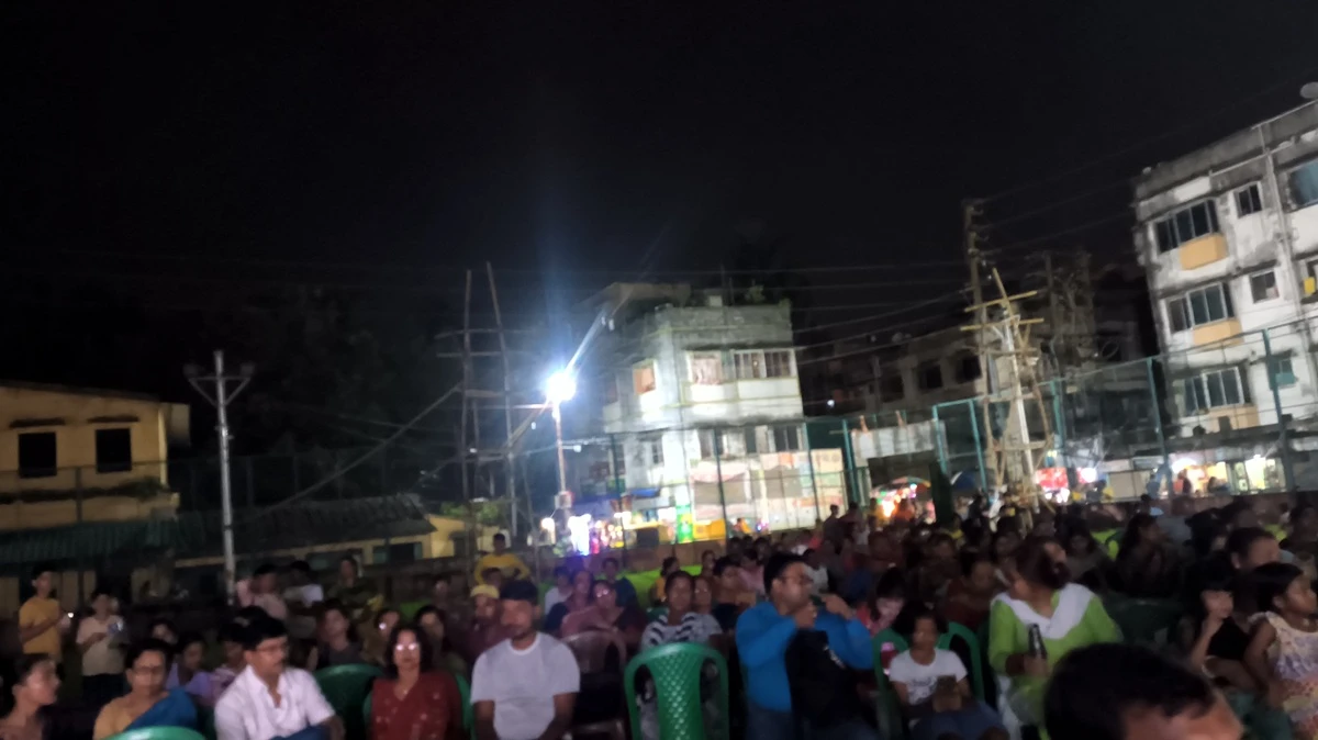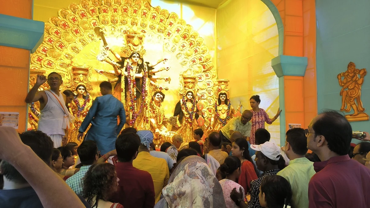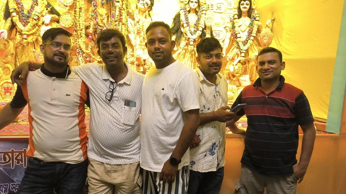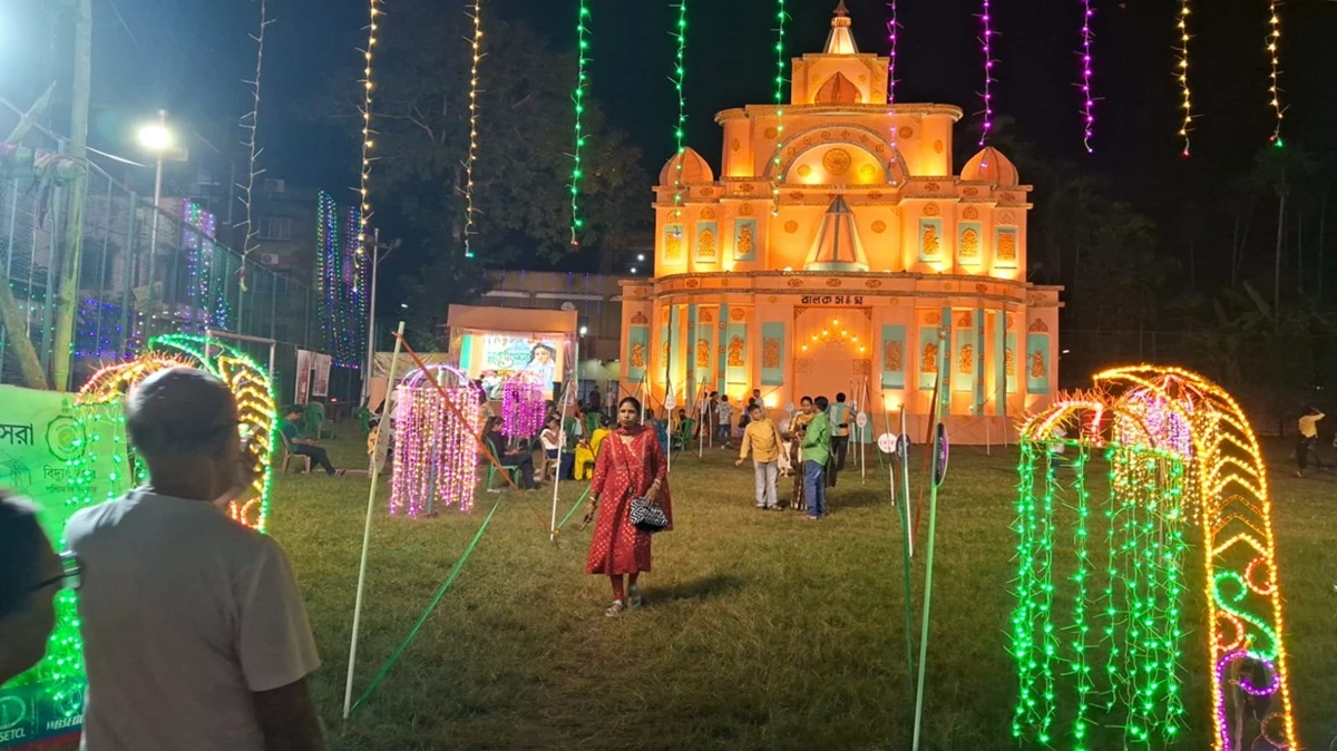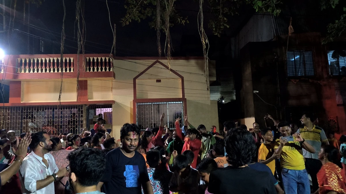 The club is decorated with colorful rangoli designs, lights, and banners, creating a cheerful and festive environment. The celebration promotes unity and joy, as people come together regardless of age, gender, or background.