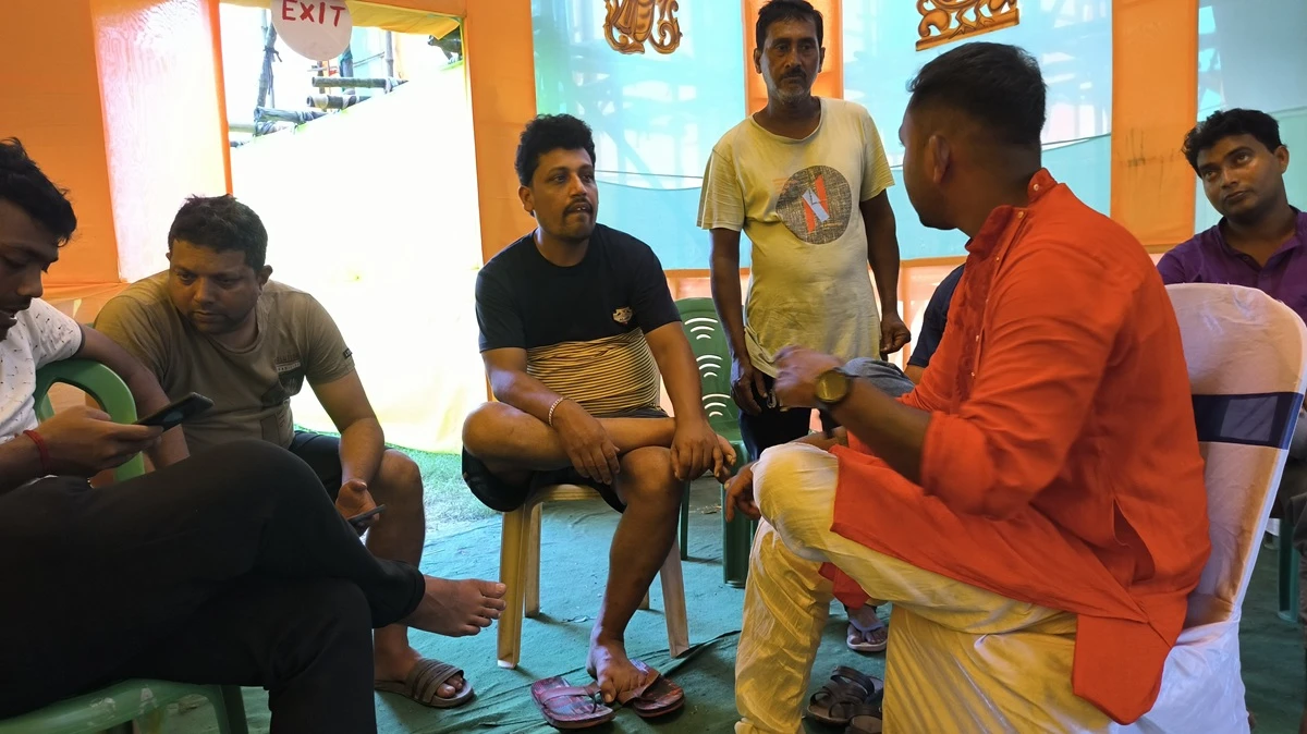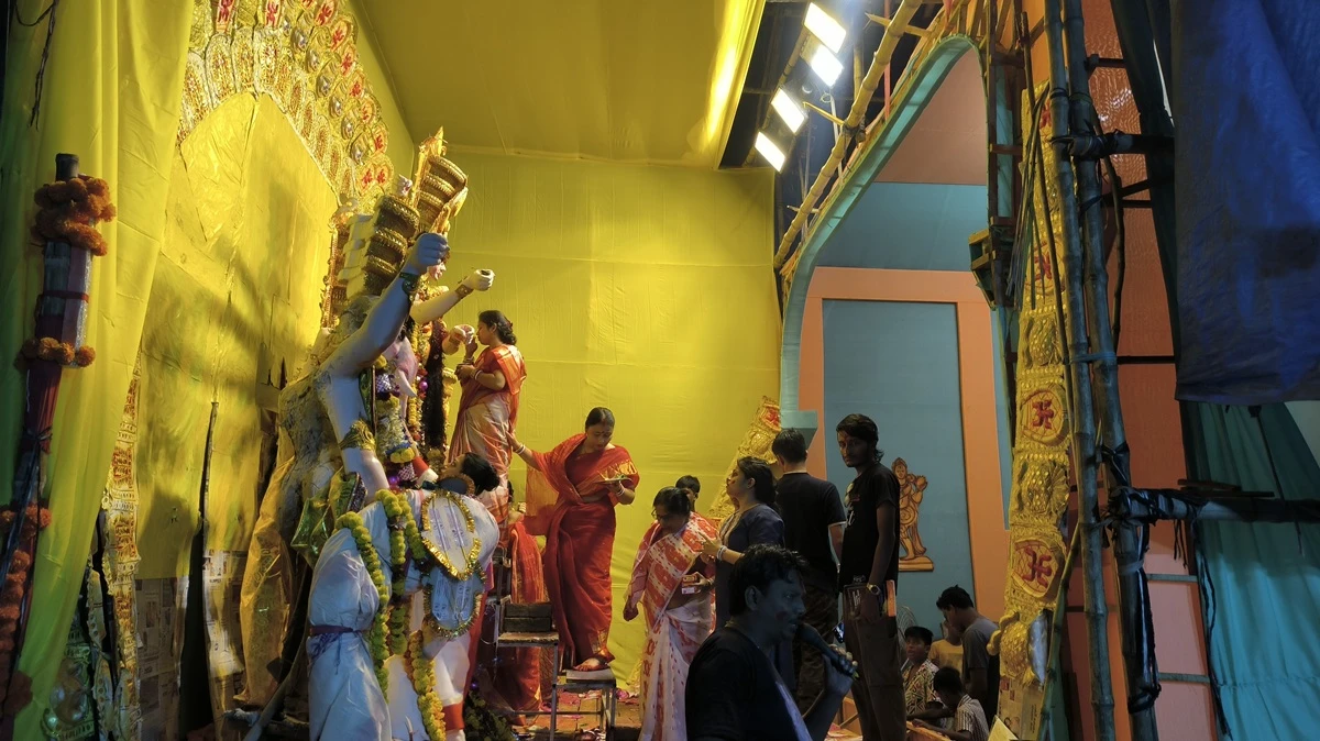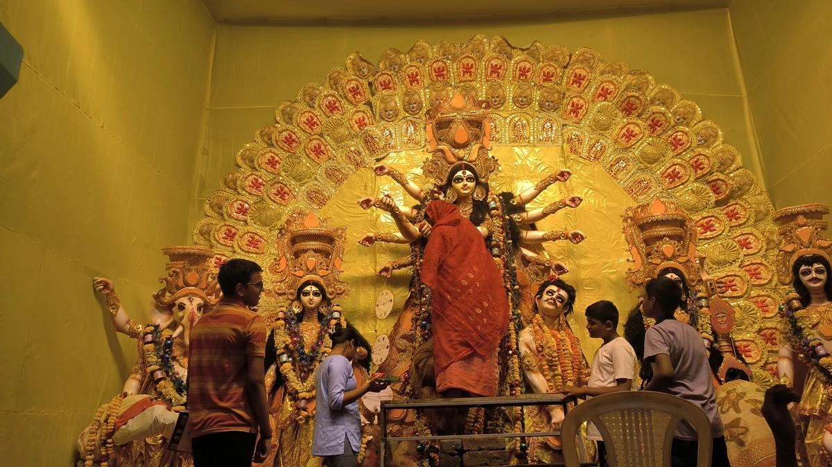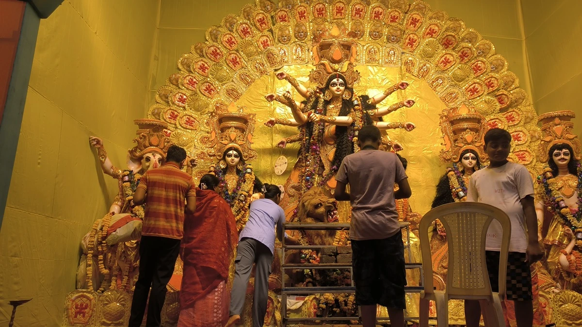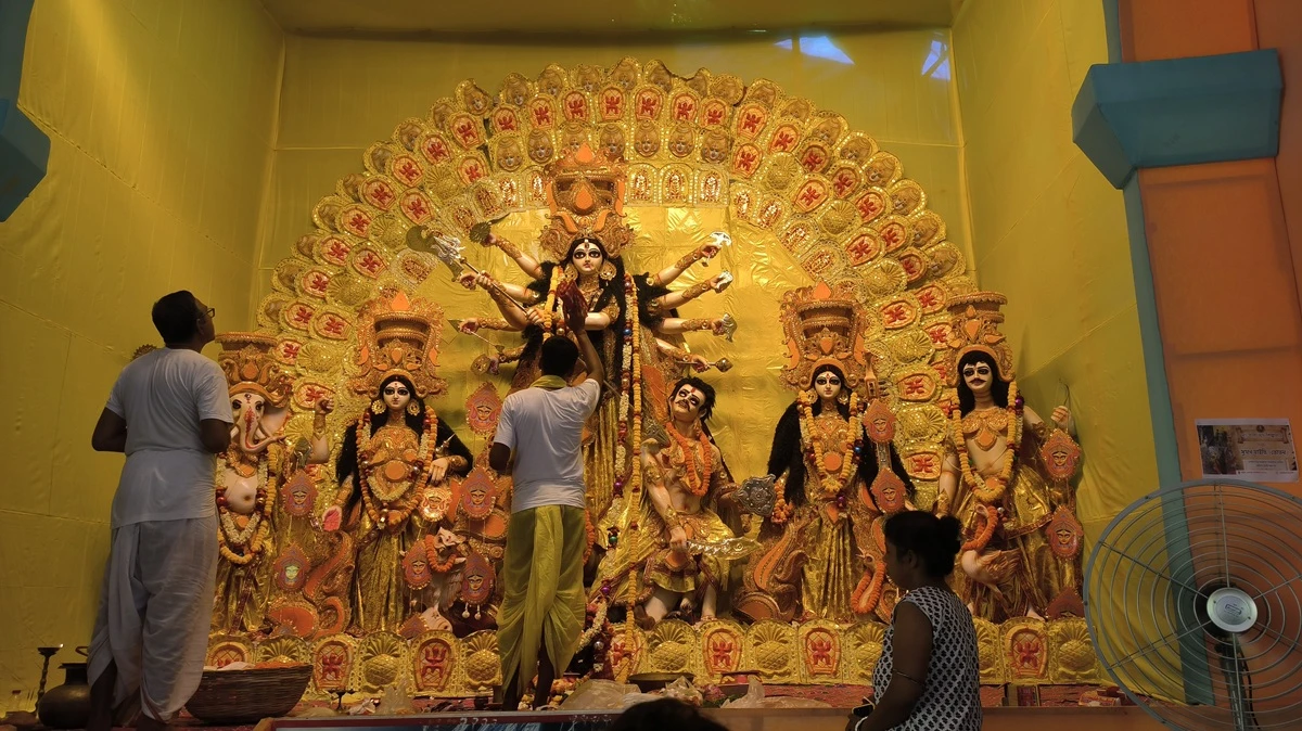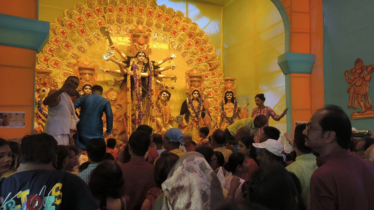 The club is decorated with colorful rangoli designs, lights, and banners, creating a cheerful and festive environment. The celebration promotes unity and joy, as people come together regardless of age, gender, or background.